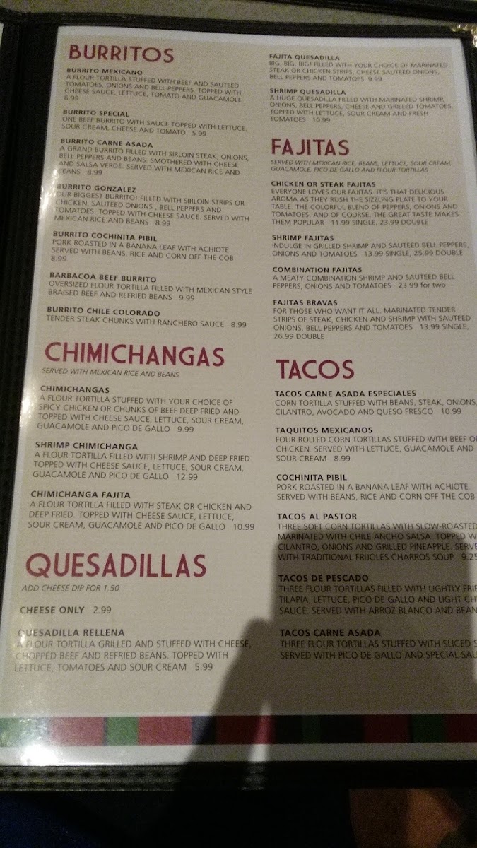 Huge, crispy flour tortilla filled with ground beef or shredded chicken, covered in queso dip and topped with lettuce, tomatoes, guacamole, cheese, and sour cream.